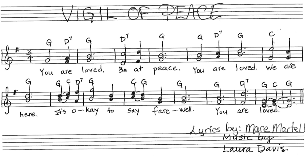 I approached Laura Davis, a person I’ve collaborated with in the past, with lyrics for a simple bedside song that can be sung as easy as “Happy Birthday”. She didn’t disappoint. Below is the music and lyrics for you to use as you need to. I sing a slight variation of notes than is written, but that’s because I’m a mediocre singer with delusions of grandeur.